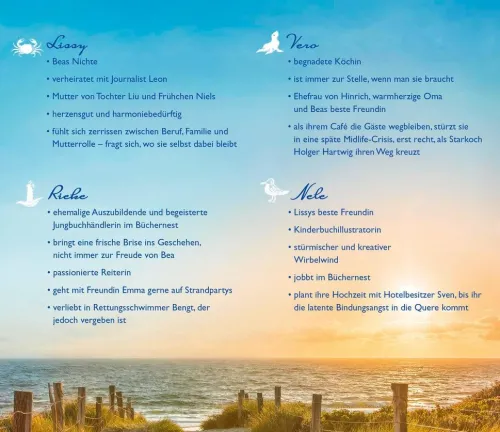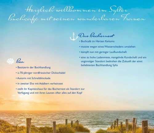 Spätsommer auf Sylt – sanfte Wattewolken tanzen am Himmel, Heckenrosen leuchten um die Wette und magischer Inselzauber verwöhnt Herz und Seele. Der Alltag der vier Freundinnen Bea, Lissy, Nele und Vero könnte sich in dieser zauberhaften Jahreszeit entschleunigen, doch das Leben schreibt auch auf der Trauminsel seine eigenen Geschichten: Lissys Sohn Niels braucht als Frühchen die volle Aufmerksamkeit der Mutter, Freundin Nele steht vor ungeahnten Hürden bei ihrer Hochzeitsplanung mit Sven, Buchhändlerin Bea plagt eine Schreibkrise und Cafébesitzerin Vero hadert mit einer späten Midlife-Crisis. Als dem Buchcafé »Büchernest« nach dem Umzug in Beas Kapitänshaus die Laufkundschaft fehlt, versucht Jungbuchhändlerin Rieke frischen Wind reinzubringen – der dickköpfigen Bea behagen die Veränderungen aber gar nicht. Als Vero und Nele sich auch noch heillos zerstreiten, wird die langjährige Freundschaft des Quartetts auf eine harte Probe gestellt . . .