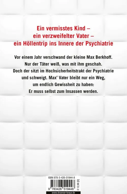 Monate nach dem Verschwinden von Max macht ein Ermittler der Mord-Kommission dem verzweifelten Vater ein unglaubliches Angebot: Er schleust ihn in das psychiatrische Gefängnis-Krankenhaus ein, in dessen Hochsicherheitstrakt Guido T. eingesperrt ist. Als falscher Patient, ausgestattet mit einer fingierten Krankenakte. Damit er dem Kindermörder so nahe wie nur irgend möglich ist und ihn zu einem Geständnis zwingen kann.