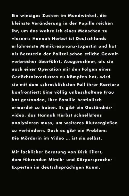 Ein winziges Zucken im Mundwinkel, die kleinste Veränderung in der Pupille reichen ihr, um das wahre Ich eines Menschen zu „lesen“: Hannah Herbst ist Deutschlands erfahrenste Mimikresonanz-Expertin, spezialisiert auf die geheimen Signale des menschlichen Körpers. Als Beraterin der Polizei hat sie schon etliche Gewaltverbrecher überführt.