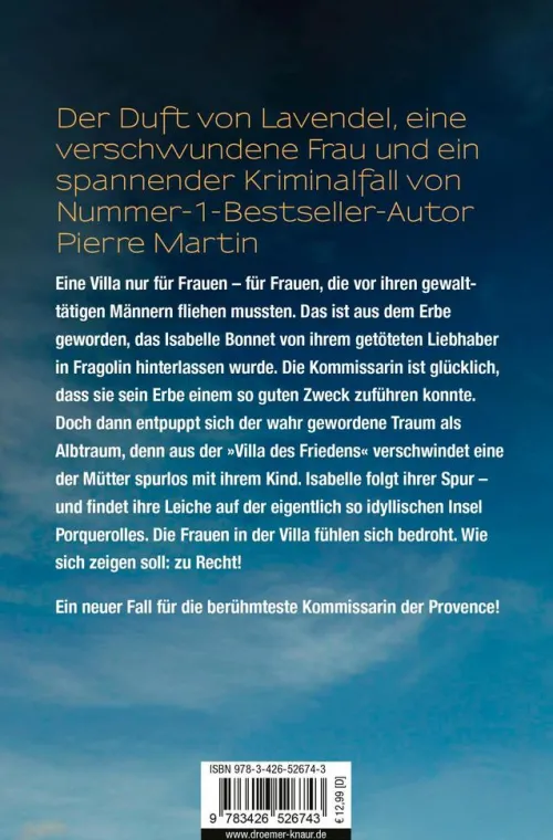 So etwas hätte sich Isabelle Bonnet nicht träumen lassen: Eine Villa nur für Frauen – für Frauen, die vor ihren gewalttätigen Männern fliehen mussten. Das ist aus dem Erbe geworden, das ihr Thierry in Fragolin hinterlassen hat. Die Kommissarin ist glücklich, dass sie seine Hinterlassenschaft einem so guten Zweck zuführen konnte. Doch dann entpuppt sich der wahr gewordene Traum als Alptraum, denn aus der „Villa des Friedens“ verschwindet eine der Mütter spurlos mit ihrem Kind. Isabelle folgt ihrer Spur – und findet ihre Leiche auf der eigentlich so idyllischen Insel Porquerolles. Die Frauen in der Villa fühlen sich bedroht. Wie sich zeigen soll: zu Recht!