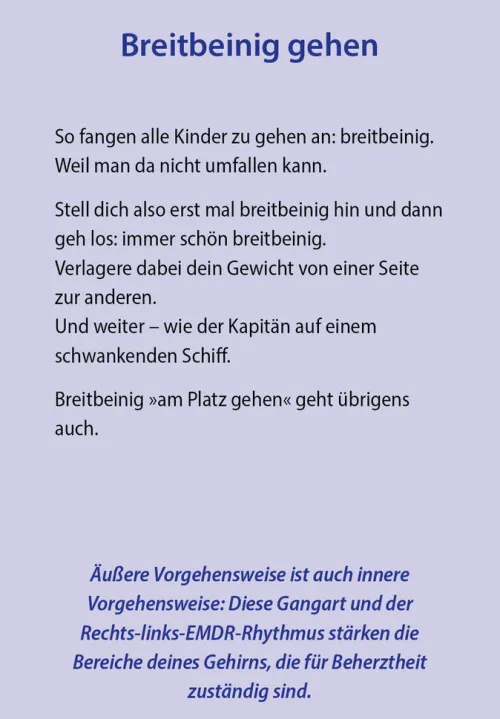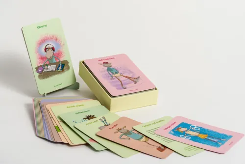 Dieses Kartenset enthält 50 der beliebtesten Übungen wie »Schulterwurf«, »Hand aufs Herz« und »Strohhalm-Atmen«, ergänzt durch 2 Zusatzkarten und ein Booklet mit weiterführenden Informationen. Ein Farbleitsystem sorgt für Orientierung, damit der Leser sofort die für ihn passende Lösung finden kann. Oder er zieht eine oder mehrere Karten nach dem Zufallsprinzip und findet so nützliche Soforthilfe. Die einzelnen Übungen sind nach Themen wie »Energie«, »Keine Panik« und »Ermutigung« sortiert.