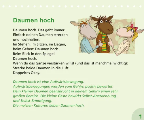 Nach sieben sehr erfolgreichen »kleinen Überlebensbüchern« und dem Kartenset »Ich schaf(f) das! « ist nun endlich eine Auswahl der beliebtesten Körperübungen von Claudia Croos-Müller als immerwährender Aufsteller lieferbar. Die Autorin präsentiert darin Übungen wie »Schulterwurf«, »Hand aufs Herz« und »Daumen hoch« für alle Lebenslagen. Auf dem ersten Blatt wird der Übungstitel zusammen mit der kongenialen Schaf-Illustration von Kai Pannen abgebildet. Auf einem zweiten Blatt folgt die Übungsanleitung.