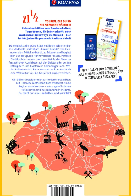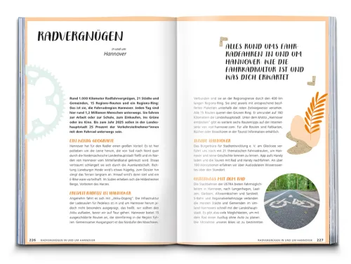 Tagestouren, die jeder schafft, Feierabendrunden zum Runterschalten und Wochenendausflüge ins Umland – hier ist für alle die passende Tour dabei. Du entdeckst die grüne Stadt mit ihrem schier endlosen Stadtwald, radelst am „Canale Grande“ von Hannover, dem Mittellandkanal, zu Museen und begibst dich auf die Spuren Hannoverscher Frauen. Perfekte Stadtfluchten führen rund ums Steinhuder Meer, zu fantastischen Aussichten auf den Deister oder zu den Rittergütern und Klöstern im Calenberger Land. Weder Badeseen noch Parks kommen zu kurz und auch eine Weltkultur-Tour bis Goslar will erobert werden.