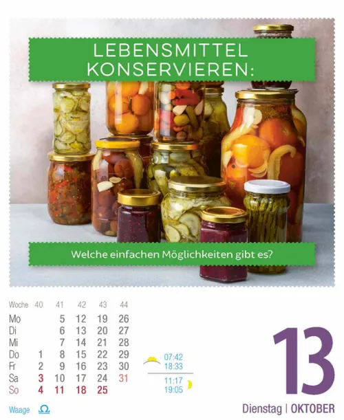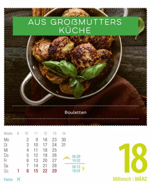 Je Wochentag ein Kalenderblatt, Samstag/Sonntag auf einem Blatt.
