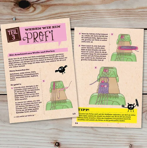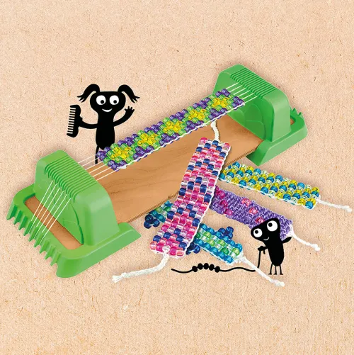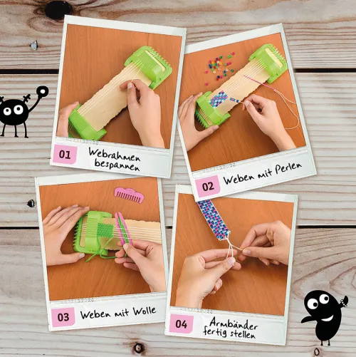 Cooles DIY-Projekt für Kinder ab 6 Jahren: Mit der „AllesKönnerKiste Perlen weben“ Armbänder in einzigartigen Designs weben. Für Einsteiger geeignet: Der hochwertige 2-in-1-Webrahmen für Wolle und Perlen lässt sich leicht handhaben. Mustervorlagen helfen bei der Umsetzung und können im Weberschiffchen festgemacht werden. Ausführliche Schritt-für-Schritt-Anleitung: In der liebevoll gestalteten Anleitung lernen angehende Schmuckdesigner die unterschiedlichen Techniken von A-Z. Freude am Lernen: Die „AllesKönnerKiste Perlen weben“ fördert Kreativität, Feinmotorik und das Gefühl für den Umgang mit verschiedenen Materialien. Hochwertiges Material: Webrahmen für Perlen und Wolle, stumpfe Nadel, Zubehör zum Weben, Wolle in lila und grün, bunte Kunststoffperlen, Anleitung. Das ideale Geschenk-Set: Die AllesKönnerKisten enthalten alle Materialien, um sofort loszulegen. Ein ideales Geschenk zum Kindergeburtstag, Einschulung oder Weihnachten. Perlen-Weben: einfach genial! Coole Armbänder, gewebt mit Perlen oder Wolle: mit dem „2-in-1-Perlenwebrahmen“ Kinder ab 6 Jahren zu Designern. Einfach der anschaulichen Anleitung folgen und den stabilen Webrahmen aus Holz und Kunststoff fix aufbauen. Der Webrahmen lässt sich schnell und einfach bespannen – so kann es sofort losgehen! Das süße Webschiffchen dient gleichzeitig als Halterung für die Musterkärtchen. Die extra-handlichen Perlen lassen sich super easy aufziehen – schneller Erfolg garantiert. Dabei können sich die kleinen Künstler überlegen, ob sie nur mit Wolle, mit Perlen oder mit beidem gleichzeitig weben möchten. Während sie ihrer kreativen Fantasie freien Lauf lassen, schulen sie nebenbei ihre feinmotorischen Fähigkeiten und ihre Geduld. Weben und staunen!