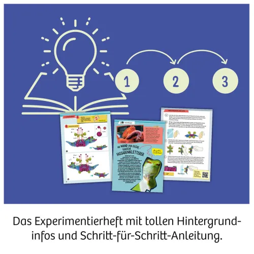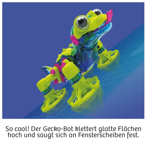 Was klettert denn da? ! Es ist der farbenfrohe Gecko-Bot, der wie sein echtes Vorbild aus der Natur mühelos Glas und glatte Oberflächen erklimmt! Aus 50 Teilen mit Motor, Schalter und Saugnäpfen bauen Kinder ihren einzigartigen Scheibenkletterer selbst zusammen und erleben, wie sich Technik mit Spielspaß vereint. Große Knopfaugen, bunte Farben und verblüffende Bewegungen machen den Gecko-Bot zu einem echten Hingucker in jedem Kinderzimmer. Das leicht verständliche Experimentierheft führt Schritt für Schritt durch den Aufbau und erklärt, wie wie Adhäsion und Saugnäpfe funktionieren. Dieser KOSMOS Experimentierkasten macht die spannende Welt der Bionik für Kinder ab acht Jahren hautnah erlebbar und sorgt für echte Aha-Momente! Her mit glatten Fenstern und gefliesten Wänden, jetzt erobert ein Roboter die senkrechten Flächen! Niedlich wie ein echter Gecko und clever durch moderne Technik verblüfft Gecko-Bot mit seinen Kletterkünsten. Aus rund 50 Teilen – inklusive Motor, Schalter, Saugnäpfen, Zahnrädern und Schrauben – bauen Kinder ab acht Jahren einen farbenfrohen Scheibenkletter-Roboter im Gecko-Design, der mühelos Glastüren und Fliesen erklimmt. Große Knopfaugen, leuchtende Farben, überraschende Bewegungen: Inspiriert vom Vorbild in der Natur klettert dieser kleine Bot stetig in die Höhe. Dank leicht verständlicher Anleitung entsteht ein kletterfreudiges Wunderwerk, das nicht nur begeistert, sondern auch spielerisch zeigt, wie Adhäsion und Saugnäpfe funktionieren.