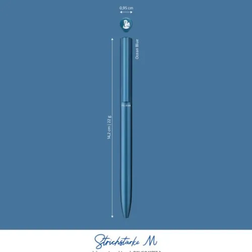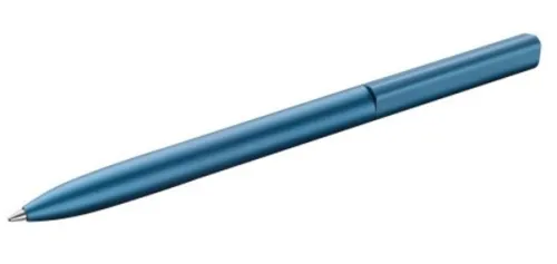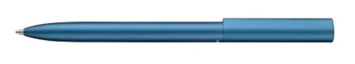 Metall-Kugelschreiber mit Drehmechanik; Puristische, Clip-lose Ausführung; Perlmutt-schimmernd eloxiertes Ober- und Unterteil; Schlanke Form; Ausgestattet mit wechselbarer Großraum-Mine; Blaue, nach ISO 12757-2 dokumentenechte Paste.