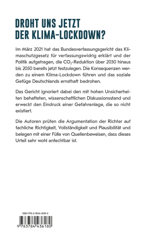 Im März 2021 hat das Bundesverfassungsgericht das Klimaschutzgesetz für verfassungswidrig erklärt und der Politik aufgetragen, die CO2-Reduktion über 2030 hinaus bis 2050 bereits jetzt zu regeln. Die Konsequenzen werden zu einem Klima-Lockdown führen und das soziale Gefüge Deutschlands auseinanderreißen. Das Gericht ignoriert dabei den mit hohen Unsicherheiten behafteten wissenschaftlichen Diskussionsstand und erweckt fälschlicherweise den Eindruck einer alternativlosen Gefahrenlage. Dieses Buch will zu einer faktenorientierten Diskussion des Urteils beitragen und prüft die Argumentation auf fachliche Richtigkeit, Vollständigkeit und Plausibilität. Die Autoren belegen mit einer Fülle von Quellenverweisen eindrucksvoll, auf welchen fehlerhaften Annahmen dieser folgenschwere Beschluss beruht.