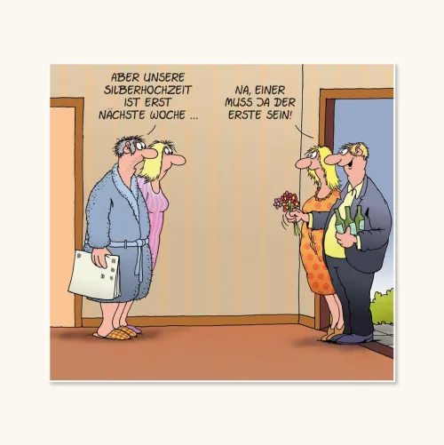 Ein Vierteljahrhundert voller gemeinsamer Höhen und Tiefen – und hoffentlich ebenso vieler Lacher! Uli Stein fängt in seinen unverwechselbaren Cartoons die kleinen und großen Momente der Ehe ein, die Paare über Jahrzehnte zusammenschweißen. Mit augenzwinkerndem Humor und feinsinniger Beobachtungsgabe zeigt er, warum die Silberhochzeit nicht nur ein Grund zum Feiern, sondern auch für ein herzliches Schmunzeln ist.