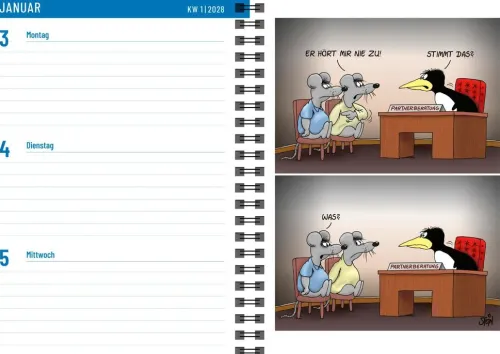 Mit Witz, Cartoons und viel Platz überzeugt dieser Wochenkalender von Uli Stein.