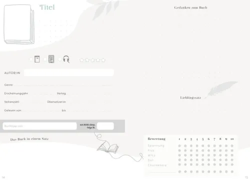 - Kreative Extra-Seiten für Lieblingsbücher und Lieblingszitate, Lesekreise, Lieblingsnacks- und getränke beim Lesen und vieles mehr