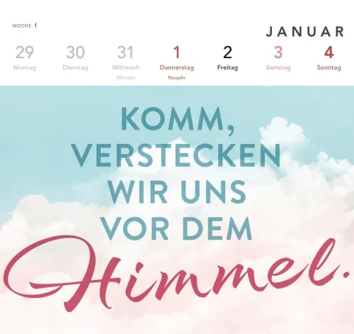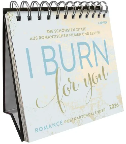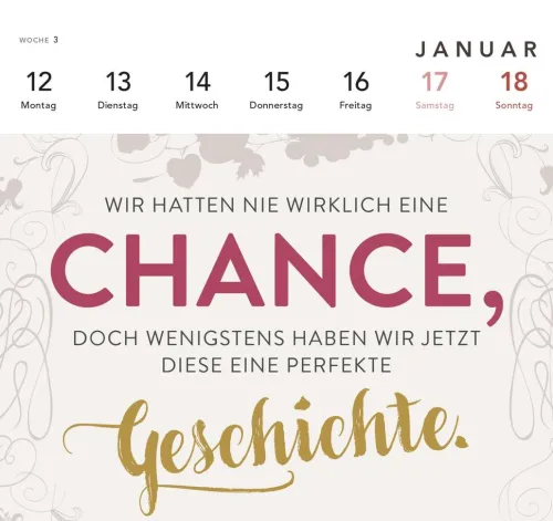 Jede Woche aufs Neue die Magie der Liebe entdecken: Die schönsten Zitate aus romantischen Filmen und Serien jetzt als veredelte Postkarten in einem Tischkalender zum Aufstellen fürs Büro oder zuhause.