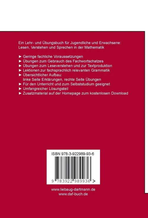 Ein Lehr- und Übungsbuch für Jugendliche und Erwachsene:Lesen, Verstehen und Sprechen in der Mathematik Geringe fachliche Voraussetzungen Übungen zum Gebrauch des Fachwortschatzes Übungen zum Leseverstehen und zur Textproduktion Lektionen zur fachsprachlich relevanten Grammatik Übersichtlicher Aufbau: linke Seite Erklärungen, rechte Seite Übungen Für den Unterricht und zum Selbststudium geeignet Umfangreicher Lösungsteil Zusatzmaterial auf der Homepage zum kostenlosen Download