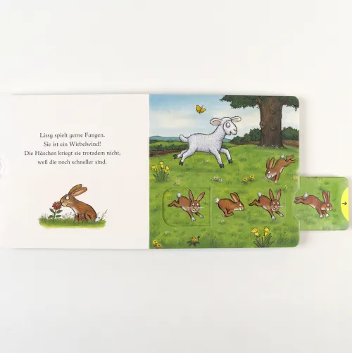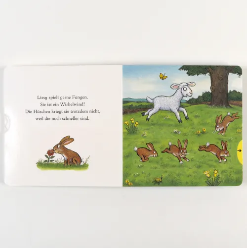 Ein vergnügtes Pappbilderbuch von dem illustrator des Grüffelo mit einfachen und lustigen Versen, in denen kleine Kinder mit dem Lämmchen hüpfen und springen können. Mit je vier Elementen zum Schieben und Ziehen.