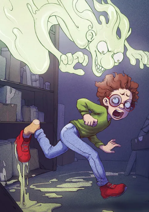 Als Tom in seinem Keller ein schimmlig-grünes Gespenst entdeckt, sitzt ihm der Schreck ganz schön in den Knochen. Der ungebetene Gast muss unbedingt wieder verschwinden und Tom weiß auch schon, wer ihm dabei helfen kann: die erfahrene Gespensterjägerin Hedwig Kümmelsaft! Doch bald wird klar, dass der Eindringling selbst ganz schön tief im Schleim steckt. . . .