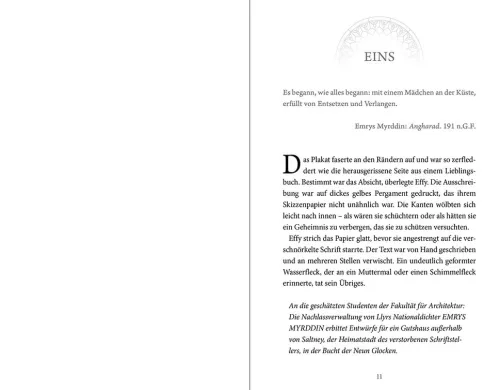 Effys größter Traum ist es, Literatur zu studieren – was Frauen in Llyr jedoch untersagt ist. Also gibt sie sich mit Architektur zufrieden. Da erhält sie eine einmalige Chance: Sie darf das Anwesen ihres verstorbenen Lieblingsautors renovieren! Doch Hiraeth Manor wird zunehmend vom Meer verschlungen. Gleichzeitig verfolgt Effy die Sagen über den Elfenkönig. Und dann ist da auch noch Preston: der Literaturstudent, der den Nachlass des Autors sichtet – und den Effy von der ersten Sekunde an nicht ausstehen kann. Bis sie gemeinsam einem dunklen Geheimnis auf die Spur kommen . . .