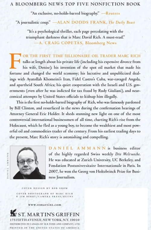 Billionaire oil trader Marc Rich for the first time talks at length about his private life (including his expensive divorce from wife Denise); his invention of the spot oil market, which made his fortune and changed the world economy; his lucrative and unpublicized dealings with Ayatollah Khomeini’s Iran, Fidel Castro’s Cuba, war-ravaged Angola, and apartheid South Africa; his quiet cooperation with the Israeli and U.S. governments (even after he was indicted for tax fraud by Rudy Guiliani) and near-comical attempts by U.S. officials to kidnap him illegally.