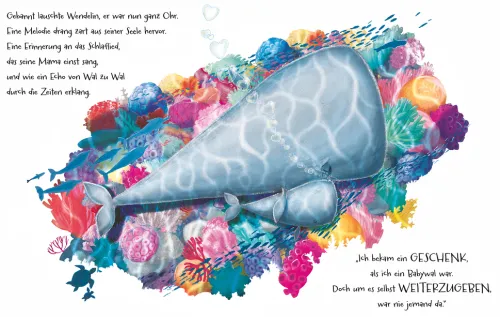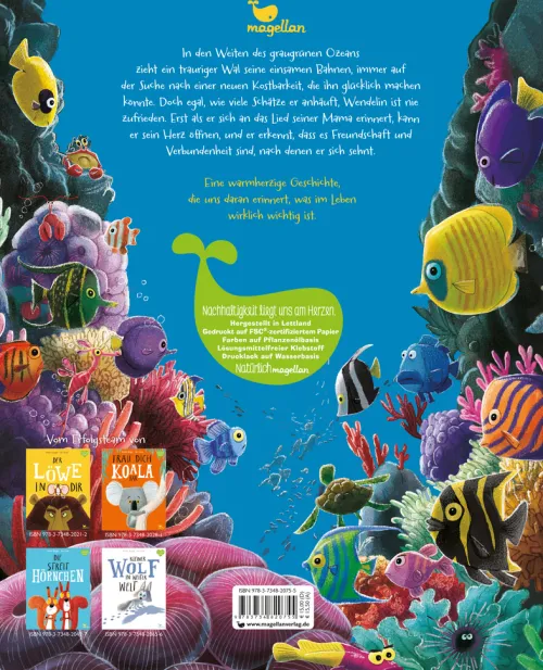In den Weiten des graugrünen Ozeans zieht ein junger Wal seine einsamen Bahnen, immer auf der Suche nach einer neuen Kostbarkeit, die ihn glücklich machen könnte. Doch egal, wie viele Schätze er anhäuft, Wendelin ist nie zufrieden. Doch dann erinnert er sich an das Lied seiner Mama, und plötzlich ist sein Herz offen und weit. Nicht funkelnde Dinge sind es, die seine Sehnsucht stillen, sondern echte Freundschaft und Verbundenheit. Eine warmherzige Geschichte darüber, was im Leben wirklich wichtig ist.