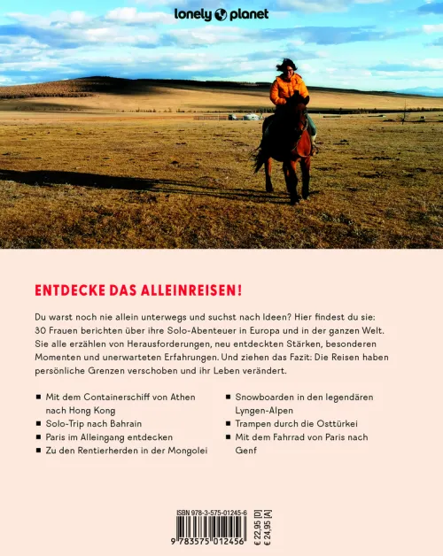 ALLEIN REISEN ist doch nichts für Frauen – das galt vielleicht noch für unsere Mütter und Großmütter, aber damit ist längst Schluss! Lonely Planet hat 30 Frauen gebeten, über ihre Solo-Reisen zu berichten. Ob allein auf einem Containerschiff über den Atlantik, zu Besuch bei Rentierhirten in der Mongolei oder pilgernd auf dem Camino Portugese – jede der 30 Reisen ist einzigartig, sehr persönlich erzählt und inspirierend. Alleine unterwegs zu sein bedeutet, viele Möglichkeiten zuzulassen, neue Freundschaften zu schließen und sich selbst besser kennenzulernen. Die Geschichten in diesem modern bebilderten Band machen allen Leserinnen Mut, selbst eine Soloreise zu planen!