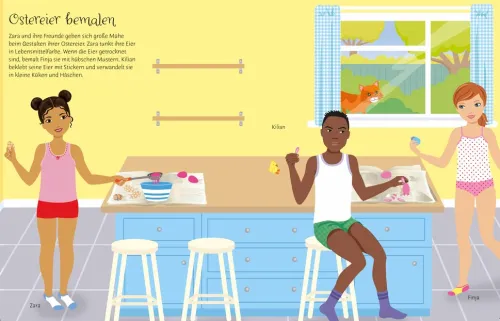 Bald ist Ostern! Sei dabei, wenn die Mädchen Lämmer füttern, Ostereier suchen und mit den Häschen spielen. Mit den über 340 Stickern kannst du sie immer passend anziehen und alles für das Osterfest vorbereiten.