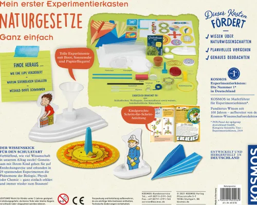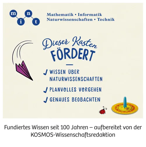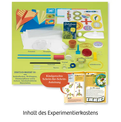 Einfach, aber verblüffend! Hier entdecken Kinder von 5 bis 8 Jahren in 29 abwechslungsreichen Versuchen die Gesetze der Natur und erleben jede Menge Forscherspaß. Wieso schillert die Seifenblase? Warum schwimmt ein Boot und wie wächst eine Pflanze? Mit diesem Experimentierkasten finden Vorschulkinder es selbst heraus! Schneiden, kleben, knicken, beobachten und vergleichen – hier ist Lernen mit allen Sinnen angesagt. Das fördert nebenbei die Feinmotorik und Konzentration. Mit Schritt-für-Schritt-Illustrationen führt die kindgerechte Anleitung sicher durch die Versuche und unterstützt so erstes Forschen auch ohne Lesekenntnisse – genau das Richtige für den Schulstart. Ein abwechslungsreicher Experimentierkasten von KOSMOS, der spielerisch erste Zusammenhänge in Biologie, Chemie und Physik vermittelt. Forschen, wie die Großen! Mit Spiel und Spaß Alltagsphänomene untersuchen und entdecken, was dahinter steckt. Wie wächst eine Pflanze und kann sie wirklich schwitzen? Vor und zu Beginn der Schulzeit können Kinder von 5 bis 8 Jahren mit diesem KOSMOS Experimentierkasten ihren Wissensdurst stillen und mit allen Sinnen lernen. Sie schneiden, falten, beobachten und begreifen, sie bauen einen Konfettimagneten und entdecken, wie aus schwarzer Farbe ein bunter Regenbogen entsteht. Die vielfältigen Materialien laden zu 29 spannenden Versuchen ein – alle anschaulich und mit altersgerechten Bildern erklärt. So können Kinder auch ohne Lesekenntnisse die Arbeitsschritte nachvollziehen. Forscherspaß und Erfolgserlebnisse garantiert!
