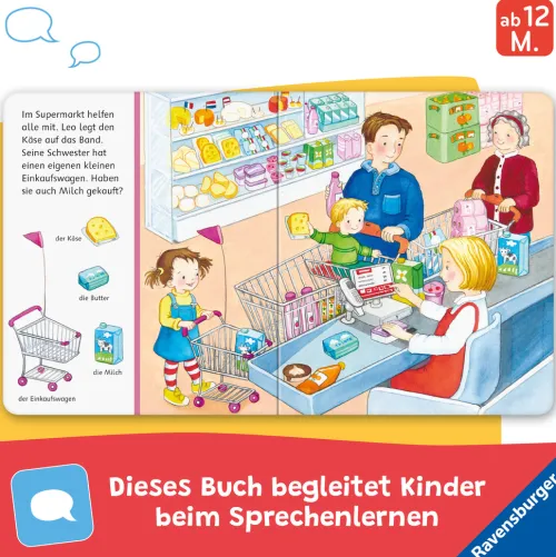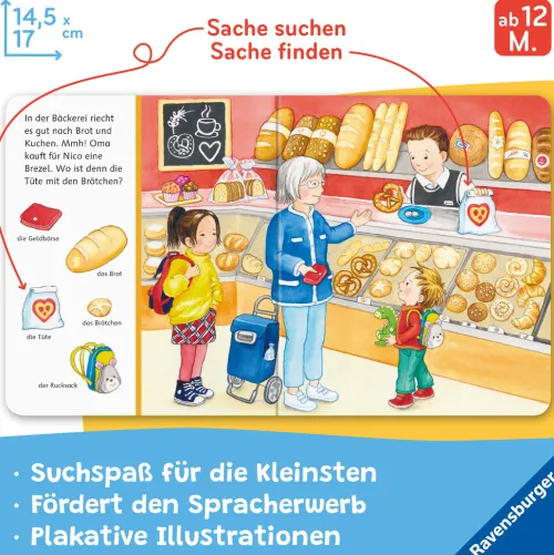 Die Pappbilderbücher aus der Kleinkindreihe „Mein erstes Sachen Suchen“ im extra handlichen Format sind der ideale Einstieg in die beliebte „Sachen suchen“-Welt. Auf jeder Doppelseite können die Kleinen ab 12 Monaten Vignetten benennen und in bekannten Situationen im Bild wiedererkennen. So wird der Spracherwerb optimal unterstützt. Die Seiten sind extra dick und damit stabil und langlebig. So können schon kleine Kinderhände diese leicht umblättern, um auf jeder Seite etwas Neues zu entdecken. In diesem Buch dreht sich alles um das gemeinsame Einkaufen in den verschiedenen Geschäften: ob in der nahen Bäckerei, im Schuhgeschäft, im großen Supermarkt, in der Buchhandlung, in der Apotheke oder auch im Hofladen. Beim Einkaufen zusammen mit den Erwachsenen können Kinder viel lernen und erleben. Und wenn auch die Kleinen mitentscheiden dürfen und liebevoll bedient werden, dann wird der Einkauf zum Vergnügen. Die plakativen Suchbilder laden zum genauen Hinsehen ein. Beim gemeinsamen Benennen und Wiederfinden wird der Wortschatz erweitert. Damit fällt das Sprechenlernen leicht!