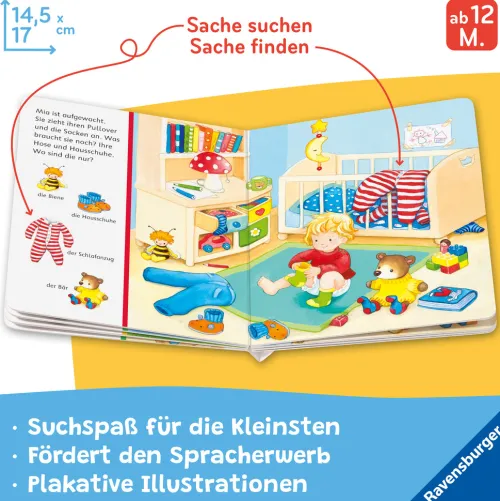Die ersten gesprochenen Wörter sind etwas ganz Besonderes: der Ball, das Buch, die Katze. Abwechslungsreiche Szenen aus dem Kinderalltag und passende Suchvignetten laden zum Suchen und Benennen ein. So wird der Spracherwerb spielerisch unterstützt.