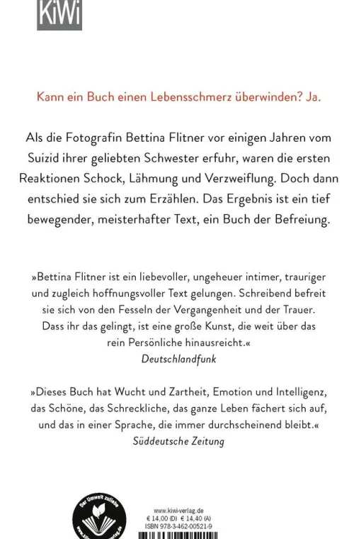 Als die Fotografin Bettina Flitner vor einigen Jahren vom Suizid ihrer geliebten Schwester erfuhr, waren die ersten Reaktionen Schock, Lähmung und Verzweiflung. Doch dann entschied sie sich zum Erzählen. Das Ergebnis ist ein tief bewegender, meisterhafter Text, ein Buch der Befreiung.