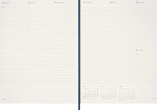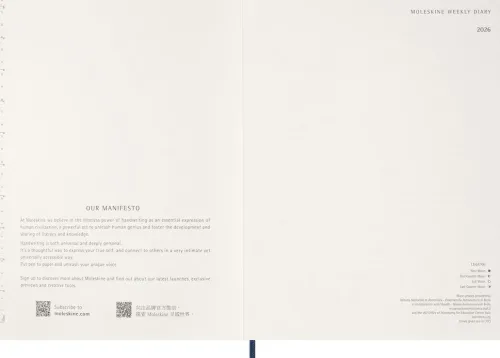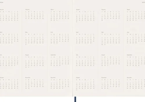 Dieser schlanke und elegante Planer im unverwechselbaren Moleskine-Design hat einen flexiblen und dennoch robusten Einband. Im Inneren ist jede Woche auf zwei Seiten dargestellt. Die Wochentage werden vertikal angezeigt, mit stü ndlichen Feldern fü r Ihre Termine von 7 bis 20 Uhr, auß er Samstag und Sonntag, die ohne Zeitangabe sind. Jede Woche enthä lt auß erdem einen kleinen 3-Monats-Kalender, um Ihrer Planung eine gewisse Perspektive zu geben.