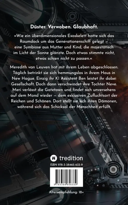 Die Erde Jahrzehnte nach uns. Die kommerzielle Raumfahrt hat Einzug gehalten im Leben der Normalbürger. Der Mond ist längst besiedelt. Giant Tech herrscht über die Welt. Die KI ist allgegenwärtig und von einem Menschen nicht mehr zu unterscheiden. Natürlich ist der Klimawandel in vollem Gange. Wer es sich leisten kann, hat sich in einer sicheren Gatetown niedergelassen. Alle anderen darben im Outscarce – dem unwirtlichen Hinterland. Doch wer richtig VIEL Geld besitzt, hat sich längst in Richtung Mond verdrückt. Dieser hat ein Migrationsproblem der ganz eigenen Art. Schlepperbanden schmuggeln Menschen und Waren in abgehalfterten Mondfähren in Richtung Erdtrabant. Allerdings, die Masse der Geflüchteten ist dem reichsten Mann der Welt ein Dorn im Auge. James Merrson wird nicht länger zusehen, wie die Schutzsuchenden »seinen« Mond überlaufen. Immerhin gibt es Hoffnung: Die Retter von »Rescue Mission« tun, was sie können, um die meisten der verloren geglaubten Seelen vor dem sicheren Tod zu bewahren. Auf der Erde hingegen sind Chaos und Resignation ausgebrochen. Die Terrororganisation »Vengeance of Gaia« sabotiert, wo sie nur kann, und geht dabei auch über zivile Leichen. Für all das interessiert sich die alkoholkranke Meredith van Leuven nicht. Sie hat längst abgeschlossen mit ihrem Leben und der Erde, wie sie einmal war. Alles, was sie noch am Leben hält ist der Wodka, den sie so sehr liebt, und ihr KI-Assistent Ben. An einem Tag im Mai verliert Meredith ihr Haus in New Hague, was eine Kettenreaktion in Gang setzt. Am Ende steht nicht weniger als der Fortbestand der Menschheit auf dem Spiel.