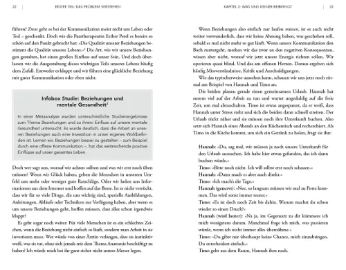 Du möchtest nicht mehr streiten, sondern gelassener kommunizieren? Doch es fällt dir im Gespräch manchmal schwer, deine Gefühle zu beherrschen und für andere Perspektiven offen zu bleiben? Bemerkungen oder das Verhalten unseres Gegenübers können alte emotionale Wunden aufreißen, wir sind dann »getriggert«. Der Schlüssel für eine gelungene Kommunikation liegt darin, deine persönlichen Trigger zu erkennen und sie zu beruhigen. Die Psychologin und Podcasterin Anouk Algermissen (@paarpsychologie) zeigt dir anhand von erprobten Übungen aus der Paartherapie und wissenschaftlich fundierten Strategien, wie du Schritt für Schritt lernst, besser zu kommunizieren. So fühlst du dich endlich gesehen und die Leichtigkeit kehrt in deine Beziehung zurück.