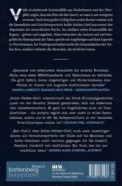 Ein hilfsbereiter Nachbar, der sich als skrupelloser Mörder entpuppt. Eine junge Mutter, die eine tödliche Entscheidung trifft. Ein Teenager, der ein grausames Verbrechen plant. . . Diese und viele weitere erschütternde Kriminalfälle aus Niederbayern und der Oberpfalz zeigen, dass das Böse oft dort lauert, wo man es am wenigsten erwartet. Journalistin und Gerichtsreporterin Isolde Stöcker-Gietl taucht in ihrem zweiten Buch erneut tief in die Abgründe der menschlichen Psyche ein und schildert wahre Kriminalfälle der Region – gelöste und ungelöste. Dabei beleuchtet die Autorin mit viel Feingefühl die Hintergründe der Taten und lässt Experten zu Wort kommen. Im Vordergrund stehen nicht die Grausamkeiten der Verbrechen, sondern vielmehr die Menschen, die involviert waren.