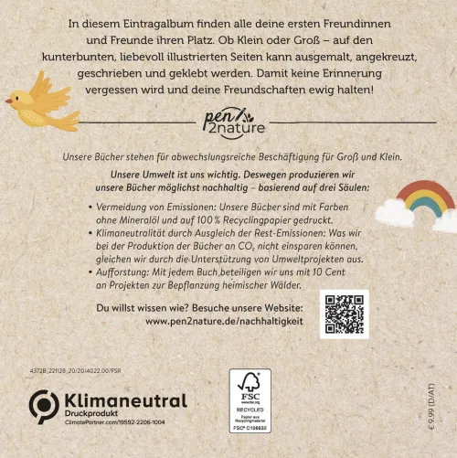 Alle Bücher und Blöcke wurden mit Farben auf Pflanzenöl-Basis und auf 100 % Recyclingpapier gedruckt. Der Verlag pen2nature unterstützt Klimaschutzprojekte und spendet 10 Cent pro Produkt für die Pflanzung neuer Bäume in heimischen Wäldern.