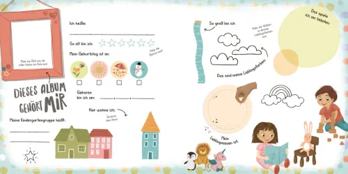 Liebevolle Ausfüllmöglichkeiten nach jedem Geschmack, Geburtstagskalender, kindliche Autogrammseite und Erinnerungsvorlagen für Fotos und Bilder sorgen für jede Menge Spaß. Illustrationen von alltäglichen Kindergartensituationen laden die Kinder zusätzlich zum Erzählen und Erinnern ein.