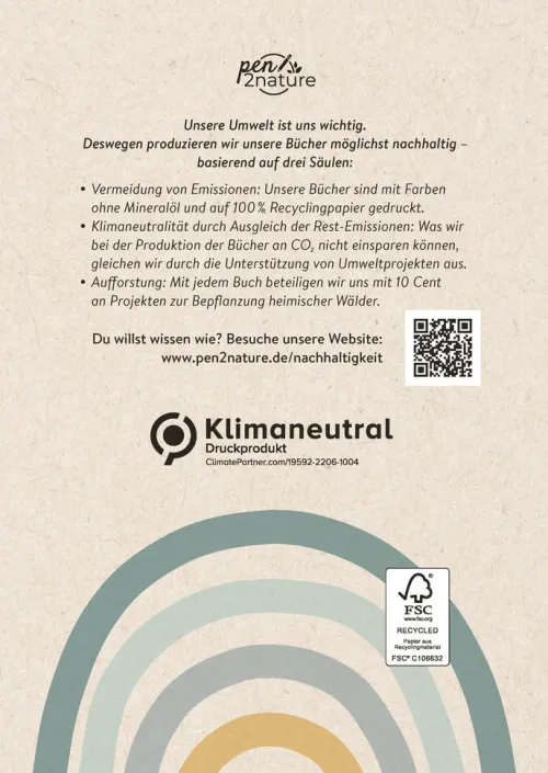 Für mehr Nachhaltigkeit im Alltag: Dieses Buch wurde mit Farben ohne Mineralöl und auf 100 % Recyclingpapier gedruckt. Rest-Emissionen werden durch die Unterstützung von Umweltprojekten ausgeglichen. Zusätzlich beteiligt sich der Verlag pen2nature mit jedem Buch mit 10 Cent an Projekten zur Bepflanzung heimischer Wälder. Wie genau das alles funktioniert? Auf seiner Website informiert der Verlag ausführlich und transparent darüber.