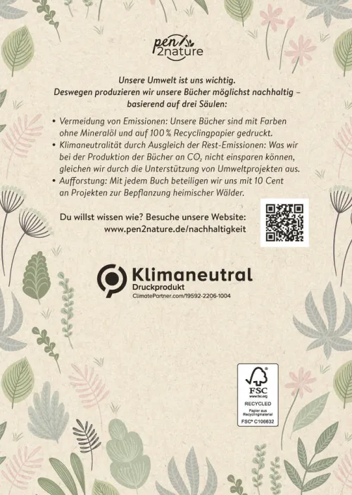 Für mehr Nachhaltigkeit im Alltag: Dieses Buch wurde mit Farben ohne Mineralöl und auf 100 % Recyclingpapier gedruckt. Rest-Emissionen werden durch die Unterstützung von Umweltprojekten ausgeglichen. Zusätzlich beteiligt sich der Verlag pen2nature mit jedem Buch mit 10 Cent an Projekten zur Bepflanzung heimischer Wälder. Wie genau das alles funktioniert? Auf seiner Website informiert der Verlag ausführlich und transparent darüber.
