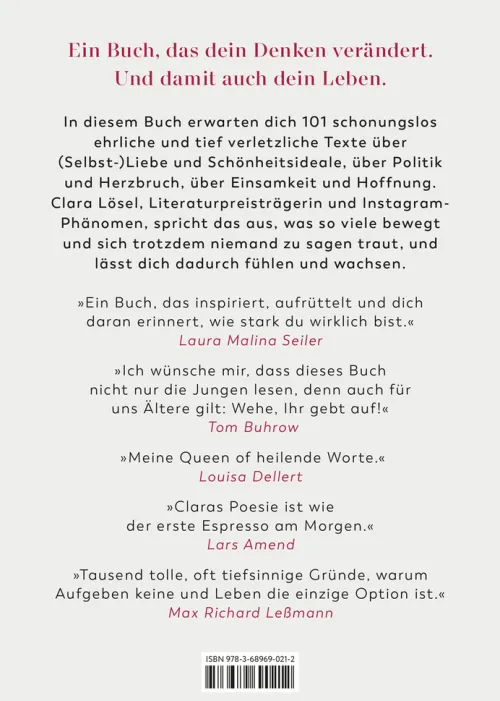 In diesem Buch erwarten dich 101 schonungslos ehrliche und tief verletzliche Texte über (Selbst-)Liebe und Schönheitsideale, über Politik und Herzbruch, über Einsamkeit und Hoffnung. Clara Lösel, Literaturpreisträgerin und Instagramphänomen, spricht das aus, was so viele bewegt und sich trotzdem niemand zu sagen traut, und lässt dich dadurch fühlen und wachsen.
