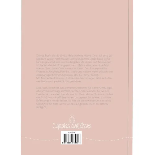 Dieses Buch bietet dir die Gelegenheit, deine Oma auf eine besondere Weise noch besser kennenzulernen. Jede Seite ist liebevoll gestaltet und den wichtigsten Stationen und Momenten im Leben deiner Oma gewidmet. Erfahre alles, was du schon immer über deine Oma wissen wolltest. Durch ausgewählte Fragen zu Kindheit, Familie, Liebe und vielem mehr entsteht ein einzigartiges Erinnerungsstück, das für immer bleibt. Mit Momentaufnahmen, Fotos oder Zeichnungen lässt sich dieses Buch noch persönlicher gestalten. Das Ausfüllbuch ist das perfekte Geschenk für deine Oma, egal ob zum Geburtstag, zu Weihnachten oder einfach nur so. Ein Geschenk, das allen Freude macht. Denn deine Oma wird sicher viel Spaß beim Ausfüllen haben und gerne ihr Wissen und ihre Erfahrungen mit dir teilen. So hat sie dann wiederum ein tolles Geschenk für dich, wenn sie das ausgefüllte Buch an dich zurückgibt.