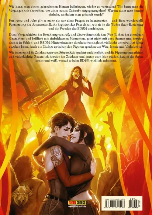 Diese Vorgeschichte der Erzählung von Ally und Lisa widmet sich den (Vor-)Leben der einzelnen Charaktere und brilliert mit einfühlsamen Momenten, geizt nicht mit sexy Szenen und beweist, dass es in Schlaf- und BSDM-Hinterzimmern durchaus (wenngleich vielleicht unfreiwillig) lustig zugehen kann. Auch die Dialoge zwischen den Figuren sprühen vor Witz, Ironie und Verbalerotik. Wie immer sind die Zeichnungen von Stjepan Sejic opulent und sinnlich, und die Figuren sympathisch und vielschichtig. Zusätzlich beweist der Zeichner und Autor auch hier wieder, dass er die Szene kennt und weiß, worauf es beim BDSM wirklich ankommt.