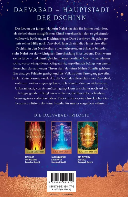 Jetzt da sich Daevabad in den Nachwehen einer verheerenden Schlacht befindet, steht Nahri vor der wichtigsten Entscheidung ihres Lebens. Doch wenn sie ihr Erbe und damit gleichsam unermessliche Macht annehmen sollte, wartet ein goldener Käfig auf sie – argwöhnisch beäugt von einem Herrscher, der auf jenem Thron sitzt, der einst Nahris Familie gehörte. Ein einziger Fehltritt genügt und ihr Volk ist dem Untergang geweiht, was das Schicksal einer ganzen Welt auf ewig besiegeln könnte.