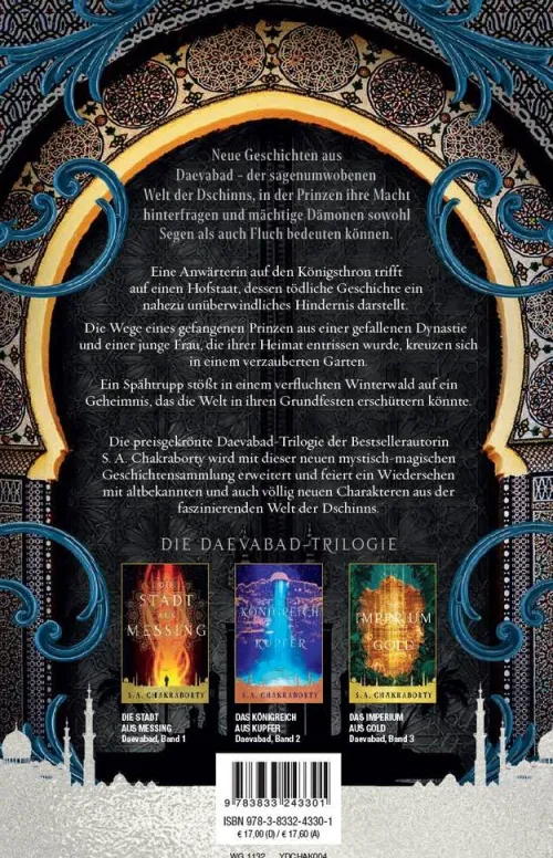 Neue Geschichten aus Daevabad – der sagenumwobenen Welt der Dschinns, in der Prinzen ihre Macht hinterfragen und mächtige Dämonen sowohl Segen als auch Fluch bedeuten können. Eine Anwärterin auf den Königsthron trifft auf einen Hofstaat, dessen tödliche Geschichte ein nahezu unüberwindliches Hindernis darstellt. Die Wege eines gefangenen Prinzen aus einer gefallenen Dynastie und einer junge Frau, die ihrer Heimat entrissen wurde, kreuzen sich in einem verzauberten Garten. Ein Spähtrupp stößt in einem verfluchten Winterwald auf ein Geheimnis, das die Welt in ihren Grundfesten erschüttern könnte. Die preisgekrönte Daevabad-Trilogie der Bestsellerautorin S. A. Chakraborty wird mit dieser neuen mystisch-magischen Geschichtensammlung erweitert und feiert ein Wiedersehen mit altbekannten und auch völlig neuen Charakteren aus der faszinierenden Welt der Dschinns.“Der Fluss aus Silber“ ist eine Erweiterung zur Daevabad-Trilogie Die Daevabad-Trilogie im ÜberblickBand 1: Die Stadt aus MessingBand 2: Das Königreich aus KupferBand 3: Das Imperium aus GoldErweiterung der Trilogie: Der Fluss aus Silber