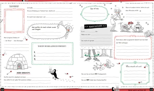 Dieses außergewöhnliche Eintragealbum hält für alle Gäste originelle Fragebögen bereit, in denen sie sich nach Herzenslust austoben können. Was haben sie gedacht, als die Hochzeitseinladung kam? Was war der Knaller vom Hochzeitsbuffet? Und wer trägt die aufwendigste Frisur? Hier können nicht nur Wünsche für das Brautpaar, sondern auch allerlei Eindrücke rund um das Fest verewigt werden. Lustige und tiefsinnige Fragen liefern dabei kreative Anregungen und machen schon das Eintragen zu einem unterhaltsamen Erlebnis. Außerdem gibt es viel Platz für gut gemeinte Ehetipps, aufschlussreiche Statistiken zum Brautpaar und jede Menge Raum zur freien Gestaltung. So entsteht eine wunderbare, einzigartige Erinnerung an diesen ganz besonderen Tag!