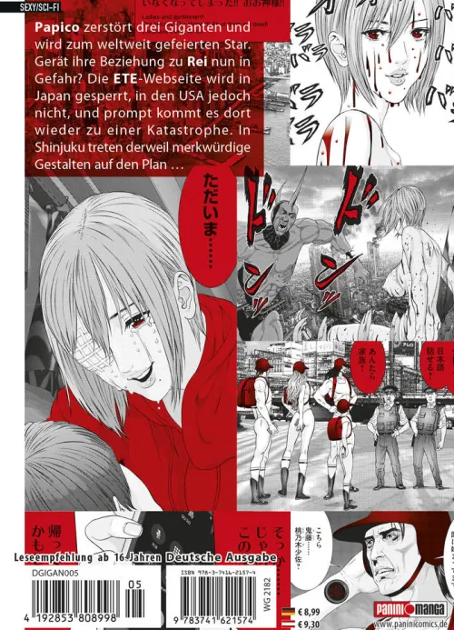 Die Geschichte um ein Superhelden-Pornosternchen und ihrem Fan! Die scheinbar gewöhnliche Pornodarstellerin Chiho „PaPiCo“ Johansson besitzt die unglaubliche Fähigkeit sich in einen riesigen Koloss zu verwandeln, und begleitet von Nachwuchsfilmregisseur und ihrem großen Fan Rei Yokoyamada nimmt sie es mit ebenso großen Bedrohungen auf, um Tokyo zu verteidigen! Das erwartet dich in Band 5:Papico zerstört drei Giganten und wird zum weltweit gefeierten Star. Gerät ihre Beziehung zu Rei nun in Gefahr? Die ETE-Webseite wird in Japan gesperrt, in den USA jedoch nicht, und prompt kommt es dort wieder zu einer Katastrophe. In Shinjuku treten derweil merkwürdige Gestalten auf den Plan . . . Für Fans von Seinen- Science-Fiction- und Ecchi-Manga!