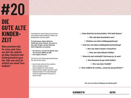 Alle Aufgaben sind ohne große Kosten und in der Nähe eures Zuhauses umsetzbar: Sammelt Punkte mit dem Bau eines verrückten Turms, einem Liebesgedicht oder dem Lieblingsessen eurer Partnerin oder eures Partners. Das Spiel für Paare ist ein wunderbares Geschenk zum Jahrestag, Valentinstag oder Hochzeitstag, denn es lässt euch intensiv Zeit miteinander verbringen und zusammen lachen.