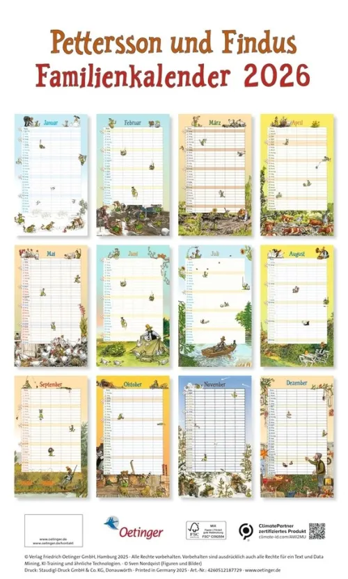 Der Klassiker mit den Original-Illustrationen von Sven Nordqvist. Wenn es nach dem kleinen Kater ginge, stünde auf jedem Kalendertag: „Findus Geburtstag“! Mit diesem reich illustrierten Familienkalender macht das Planen gleich noch mehr Spaß. Die Illustrationen aus den Bilderbüchern rund um Pettersson und Findus begeistern Groß und Klein und machen die Alltagsorganisation ein bisschen hyggeliger.