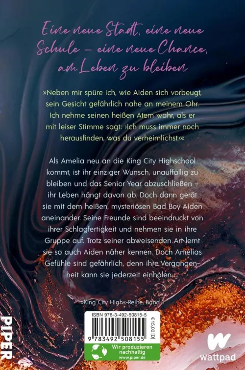 Als Amelia neu an die King City Highschool kommt, ist ihr einziger Wunsch, unauffällig zu bleiben und das Senior Year abzuschließen – ihr Leben hängt davon ab. Doch dann stößt sie mit dem heißen, mysteriösen Bad Boy Aiden zusammen und gerät mit ihm aneinander. Seine Freunde sind beeindruckt von ihrer Schlagfertigkeit und nehmen sie in ihre Gruppe auf. Trotz seiner abweisenden Art lernt Amelia so auch Aiden näher kennen und ehe sie sich versieht, verliebt sie sich in den verschlossenen Jungen mit weichem Kern und düsterer Vergangenheit. Doch Amelias Gefühle sind gefährlich, denn ihre Vergangenheit kann sie jederzeit einholen . . .