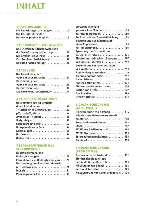 - Alle abiturrelevanten Themen enthalten: Reaktionskinetik, chemisches Gleichgewicht, Säure-Basen-Reaktionen, Redoxreaktionen und Elektrochemie, Organische Chemie, Kunststoffe, Farbstoffe, Pharmaprodukte, Radioaktivität etc.