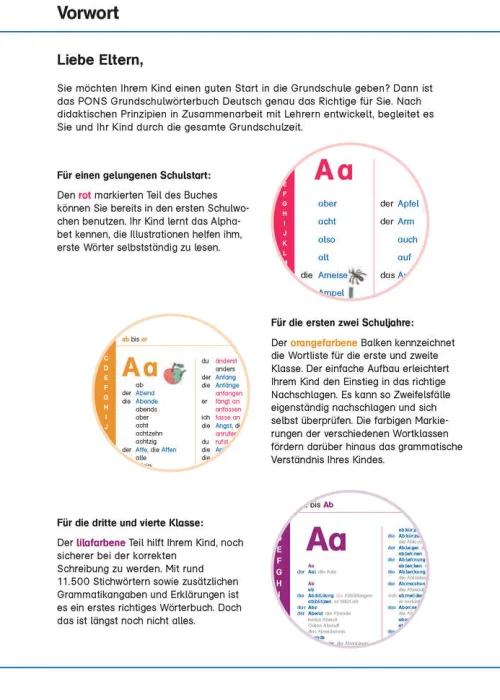 - Speziell für die ersten vier Schuljahre: Nach Klassenstufen aufbereitete Wörterverzeichnisse begleiten Ihr Kind durch die gesamte Grundschulzeit.