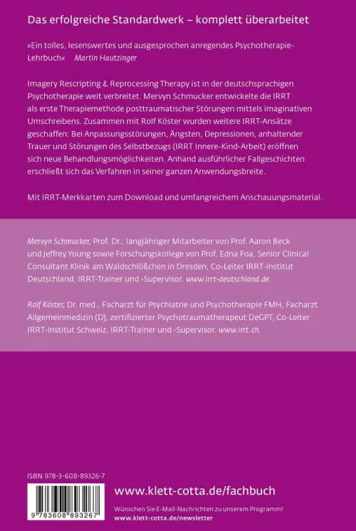 Imagery Rescripting & Reprocessing Therapy ist in der deutschsprachigen Psychotherapie inzwischen weit verbreitet. Mervyn Schmucker entwickelte die IRRT ursprünglich zur schonenden Trauma-Konfrontation. Belastende Bilder und tief sitzende Blockaden werden mit imaginativen Mitteln transformiert, um eine emotionale Bewältigung zu erreichen. Zusammen mit Rolf Köster übertrug er diese Methode auf andere Störungen mit Verarbeitungsblockaden: Bei Anpassungsstörungen, Ängsten, Depressionen, anhaltender Trauer und Störungen des Selbstbezugs (IRRT Innere-Kind-Arbeit) eröffnen sich neue Behandlungsmöglichkeiten. Anhand ausführlicher Fallgeschichten erschließt sich das Verfahren in seiner ganzen Anwendungsbreite.