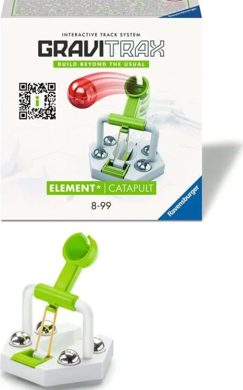 Mit dem GraviTrax Element Catapult wird die Schwerkraft außer Kraft gesetzt und die Kugeln fliegen über den Track. Mit dem GraviTrax Element Catapult fliegt die Kugel über die gebaute GraviTrax-Bahn. So können Hindernisse und Höhenunterschiede in der Bahn spektakulär überwunden werden. Rollt eine Kugel in das Catapult, wird ein Hebel gelöst, so dass der Arm mit der Kugel unglaublich schnell nach oben schießt und so die Kugel weit von sich katapultiert. Kombiniert mit einem beliebigen GraviTrax Starter-Set bringt das Element Catapult auf diese Weise noch mal ganz neuen Schwung und Energie in die Kugelbahn. Benötigt das GraviTrax Starterset